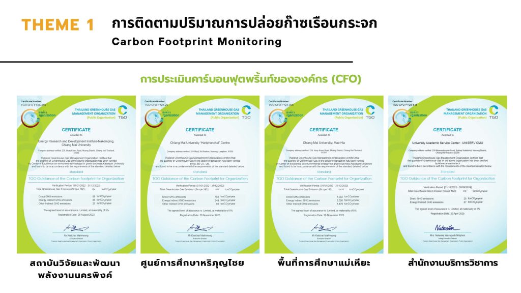 เพื่อสร้างความเชื่อมั่นและมาตรฐานที่เป็นที่ยอมรับในระดับประเทศและนานาชาติ CMU ได้ดำเนินการ ประเมินและขอรับรองค่าคาร์บอนฟุตพริ้นท์องค์กร (Carbon Footprint for Organization: CFO) จาก องค์การบริหารจัดการก๊าซเรือนกระจก (องค์การมหาชน) – อบก.