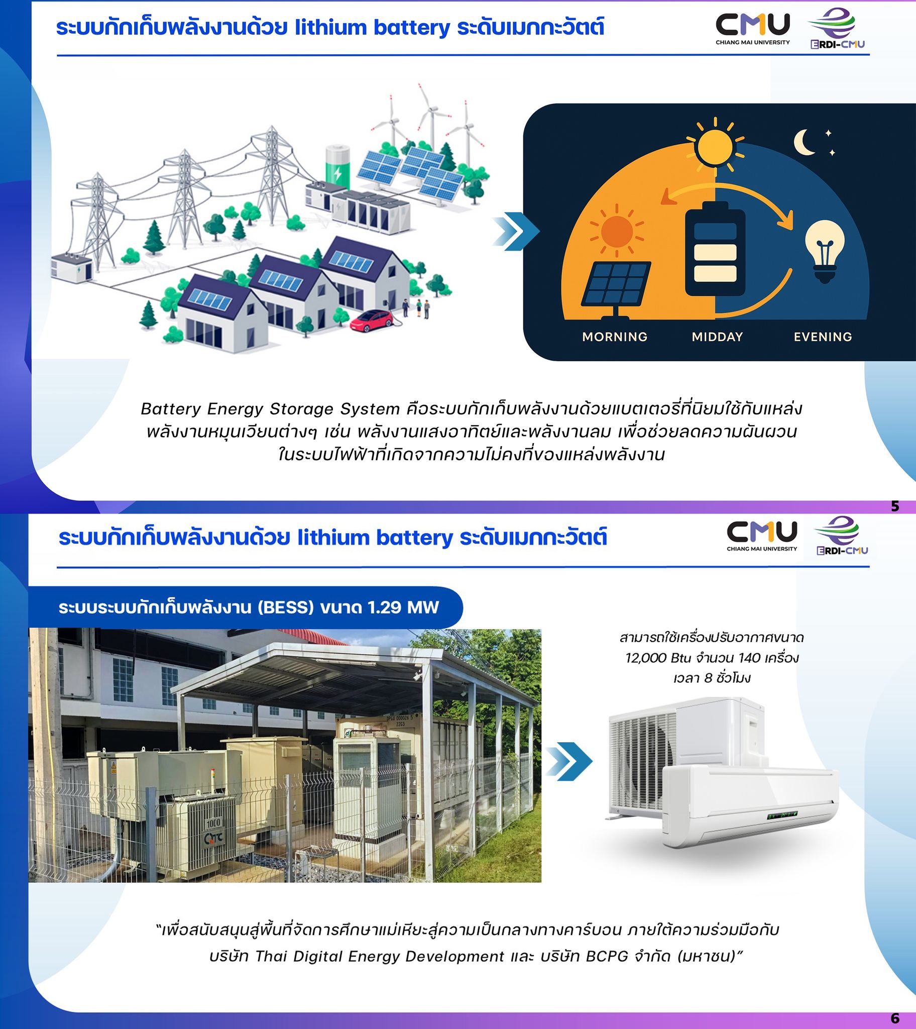 การใช้พลังงานหมุนเวียน เช่น พลังงานแสงอาทิตย์ มักมีข้อจำกัดที่สำคัญคือ “การผลิตไม่ต่อเนื่อง” เพราะสามารถผลิตได้เฉพาะช่วงที่มีแสงแดดเท่านั้น ส่งผลให้ช่วงกลางคืนหรือวันที่มีเมฆมาก ระบบไฟฟ้าอาจมีความไม่เสถียรหากไม่มีแหล่งสำรองพลังงานที่เพียงพอเพื่อแก้ปัญหานี้ มหาวิทยาลัยเชียงใหม่จึงได้ติดตั้ง ระบบกักเก็บพลังงานด้วยแบตเตอรี่ลิเธียม (BESS) ขนาด 1.29 เมกะวัตต์ ซึ่งทำหน้าที่เป็นแบตเตอรี่ขนาดใหญ่เก็บพลังงานที่ผลิตจากโซลาร์เซลล์ในช่วงกลางวัน และจ่ายไฟกลับเข้าสู่ระบบในช่วงเวลาที่ไม่สามารถผลิตไฟฟ้าได้ เช่น กลางคืน หรือตอนที่โหลดพลังงานสูงกว่าการผลิต