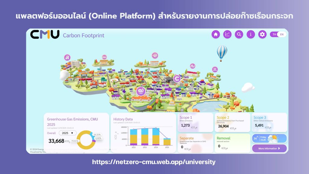 • แพลตฟอร์ม CMU Carbon Footprint Online แสดงผลข้อมูลแบบเรียลไทม์ สามารถรายงานการปล่อยก๊าซได้ทั้ง Scope 1, Scope 2 และ Scope 3 มีการแสดงผลในรูปแบบ Dashboard เข้าใจง่าย