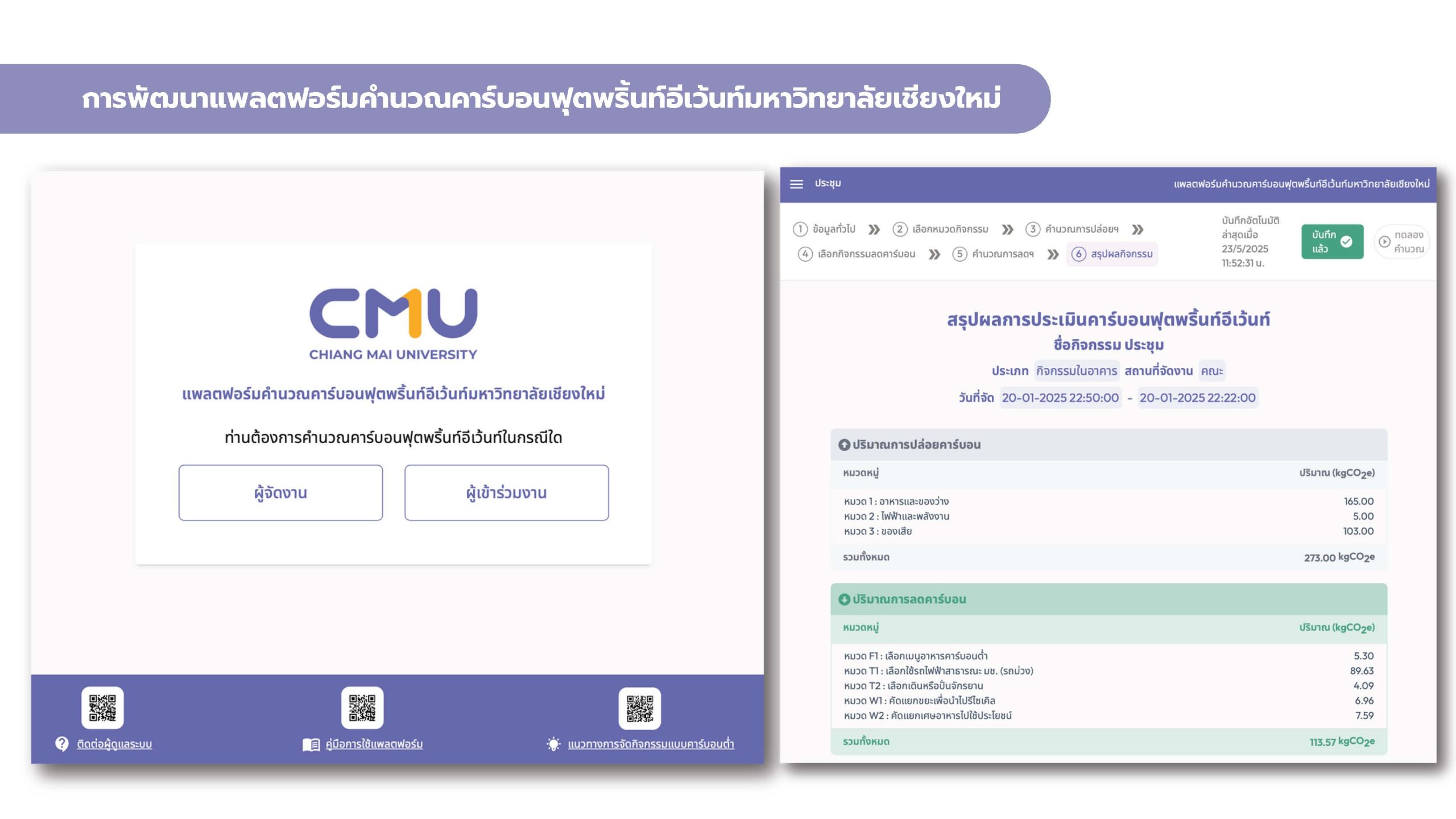 • แพลตฟอร์มคาร์บอนฟุตพริ้นท์อีเว้นท์ ของมหาวิทยาลัยเชียงใหม่ ที่ช่วยให้ผู้จัดงานสามารถวัดผลการปล่อยและการลดคาร์บอนได้อย่างเป็นระบบ