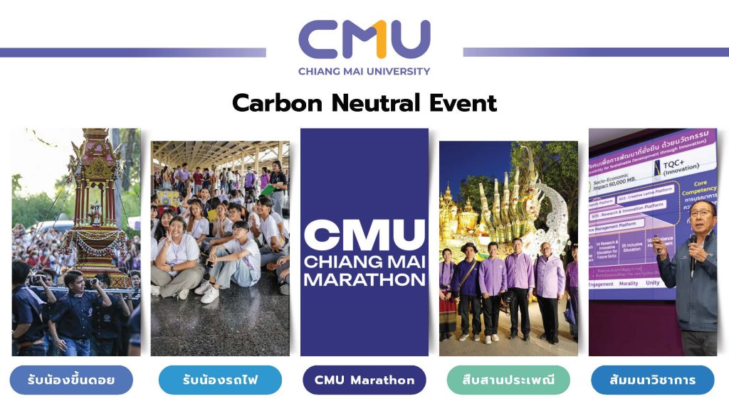 • Carbon Neutral Event เช่น งาน “รับน้องขึ้นดอย”, “CMU Marathon”, งานสืบสานประเพณี และการสัมมนาวิชาการ ที่มีการคำนวณและชดเชยคาร์บอนฟุตพริ้นท์ของกิจกรรม